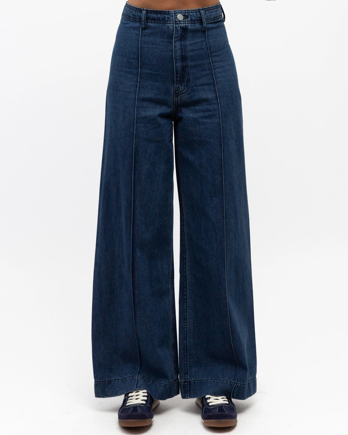 ∙ VV11824 ∙ 100% Cotton ∙ 8:10:12:14:16=2:2:2:1:1 ∙ High waist ∙ Back pockets ∙ Zip fly front with button closure ∙ Front yoke seams design ∙ Fixed waistline with belt loops ∙ Full length ∙ Relaxed fit ∙ Our model is wearing size 8