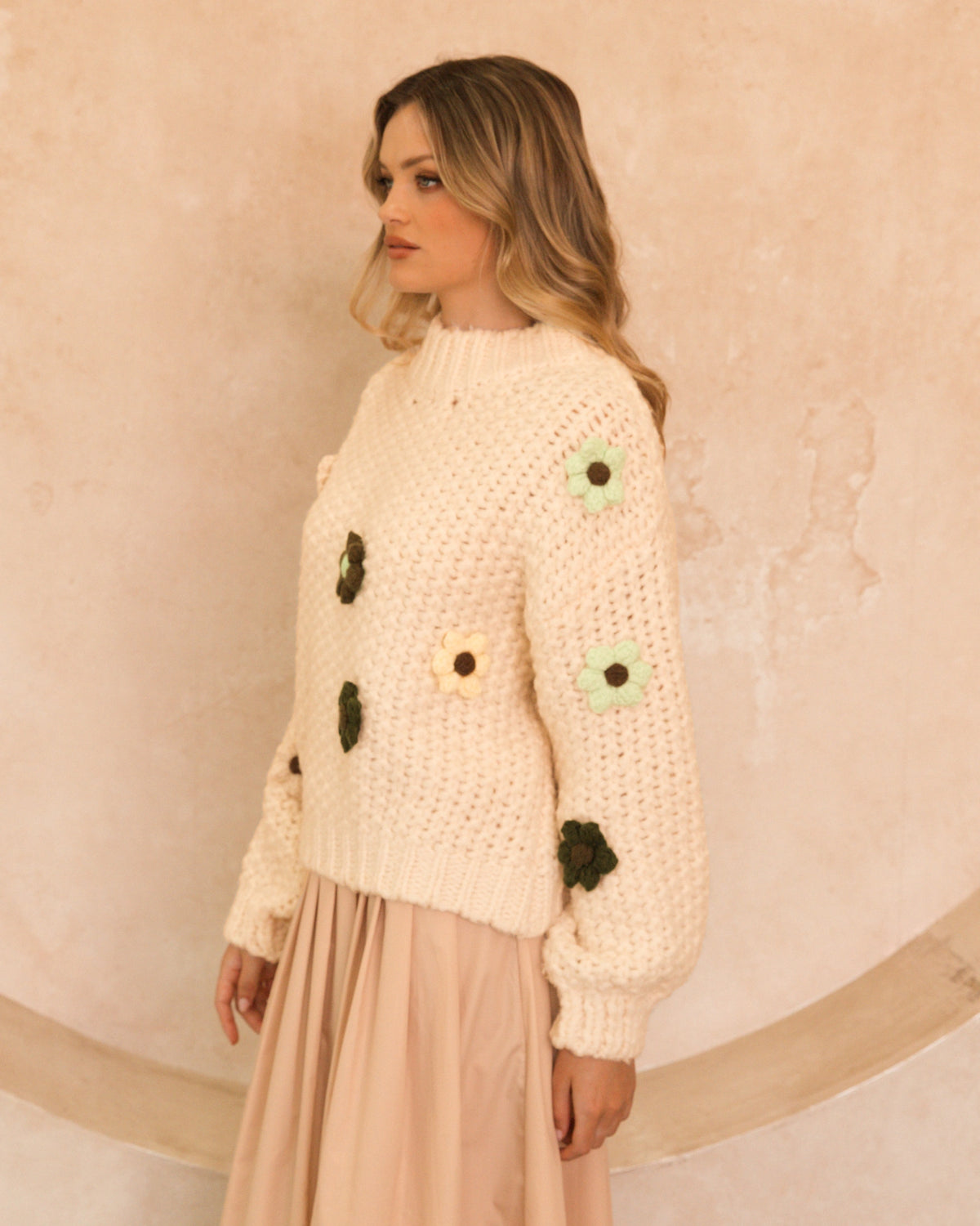 ∙ VV11894∙ Polyester∙ XS:S:M:L=1:3:2:2∙ High neckline∙ Long sleeve∙ Crochet puff flower detail∙ Dropped shoulder seams∙ Chunky knit design∙ Relaxed fit∙ Our model is wearing size S