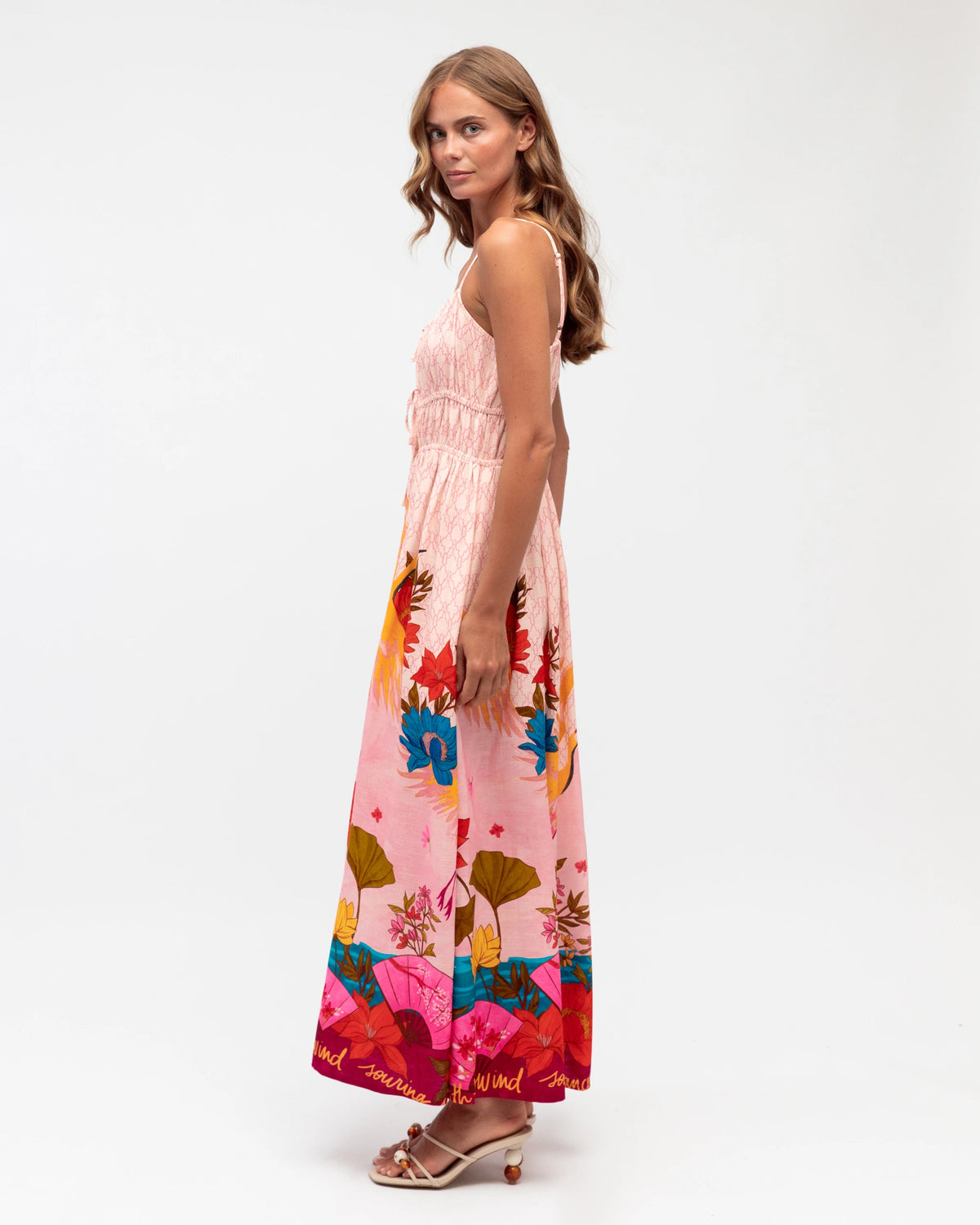 ∙ VVNE11705∙ Rayon/Linen∙ 8:10:12:14:16=2:2:2:1:1∙ Exclusive print∙ Square neckline∙ Sleeveless∙ Thin adjustable straps∙ Ruffle design∙ Shirred bodice∙ Maxi length∙ Relaxed fit∙ Our model is wearing size 8
