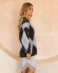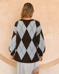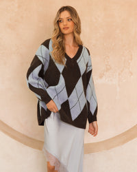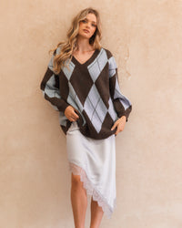 ∙ VV11806 ∙ Acrylic ∙ S/M:M/L=4:3 ∙ V-neckline ∙ Long sleeve ∙ Drop shoulder detail ∙ Ribbed neckline, cuffs and hem ∙ Argyle pattern ∙ Ribbed trim ∙ Relaxed fit ∙ Our model is wearing size S