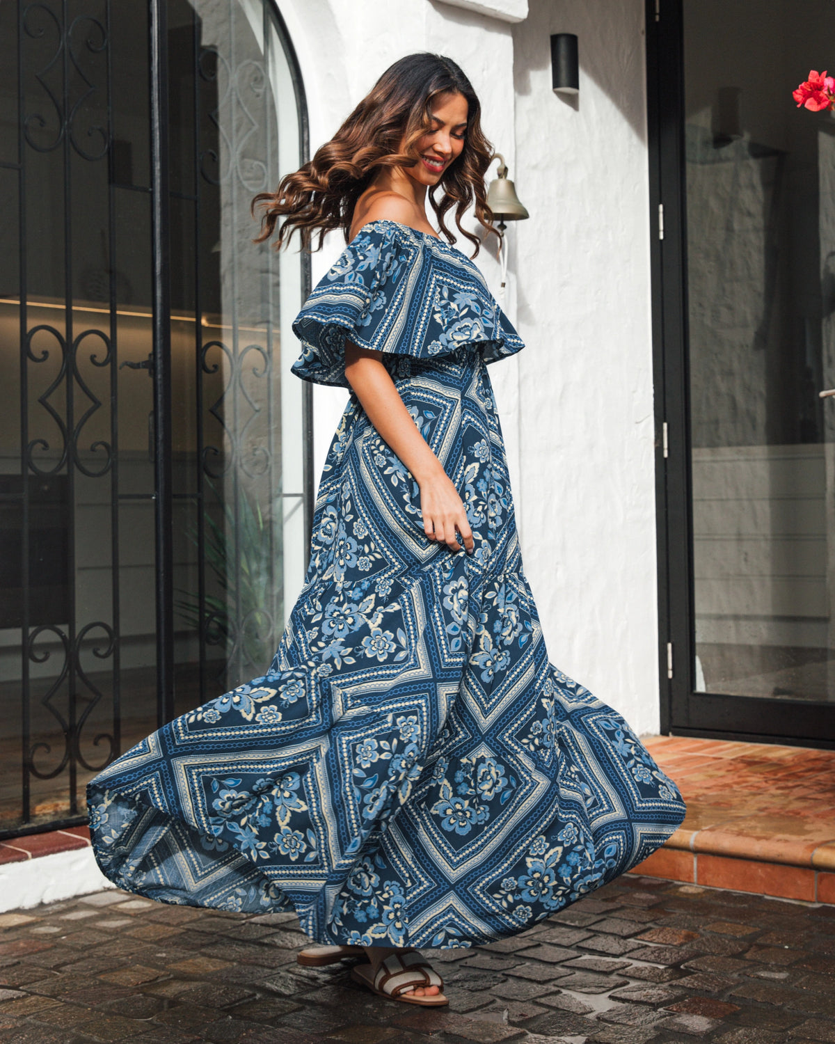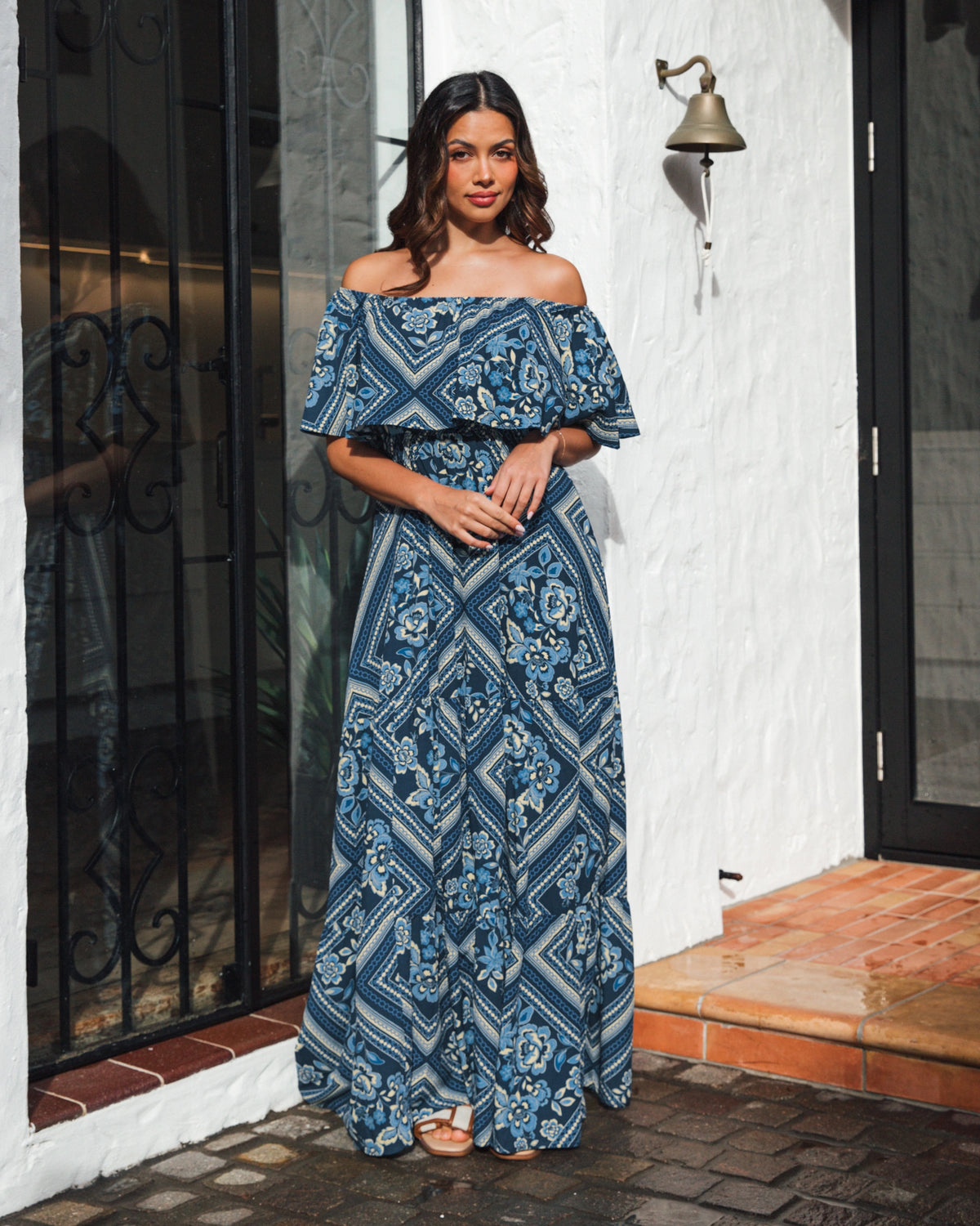 ∙ LOLE70731 ∙ Rayon ∙ S:M:L:XL:XXL=2:2:2:2:1 ∙ Exclusive print ∙ Off the shoulder neckline ∙ Fluttered sleeves detail ∙ Tiered detail ∙ Maxi length ∙ Regular fit ∙ Our model is wearing size S