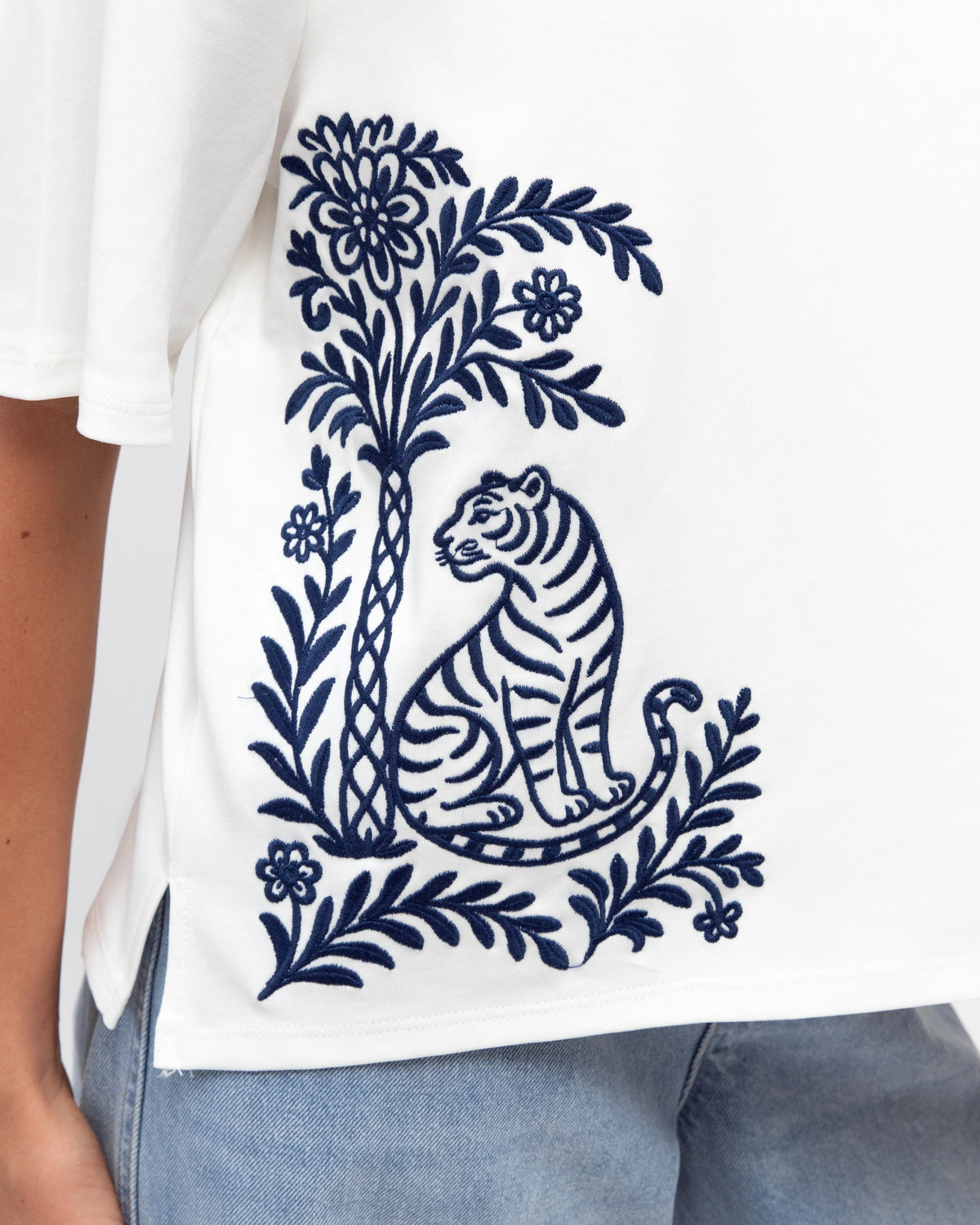 ∙ Blue embroidered tiger and floral design