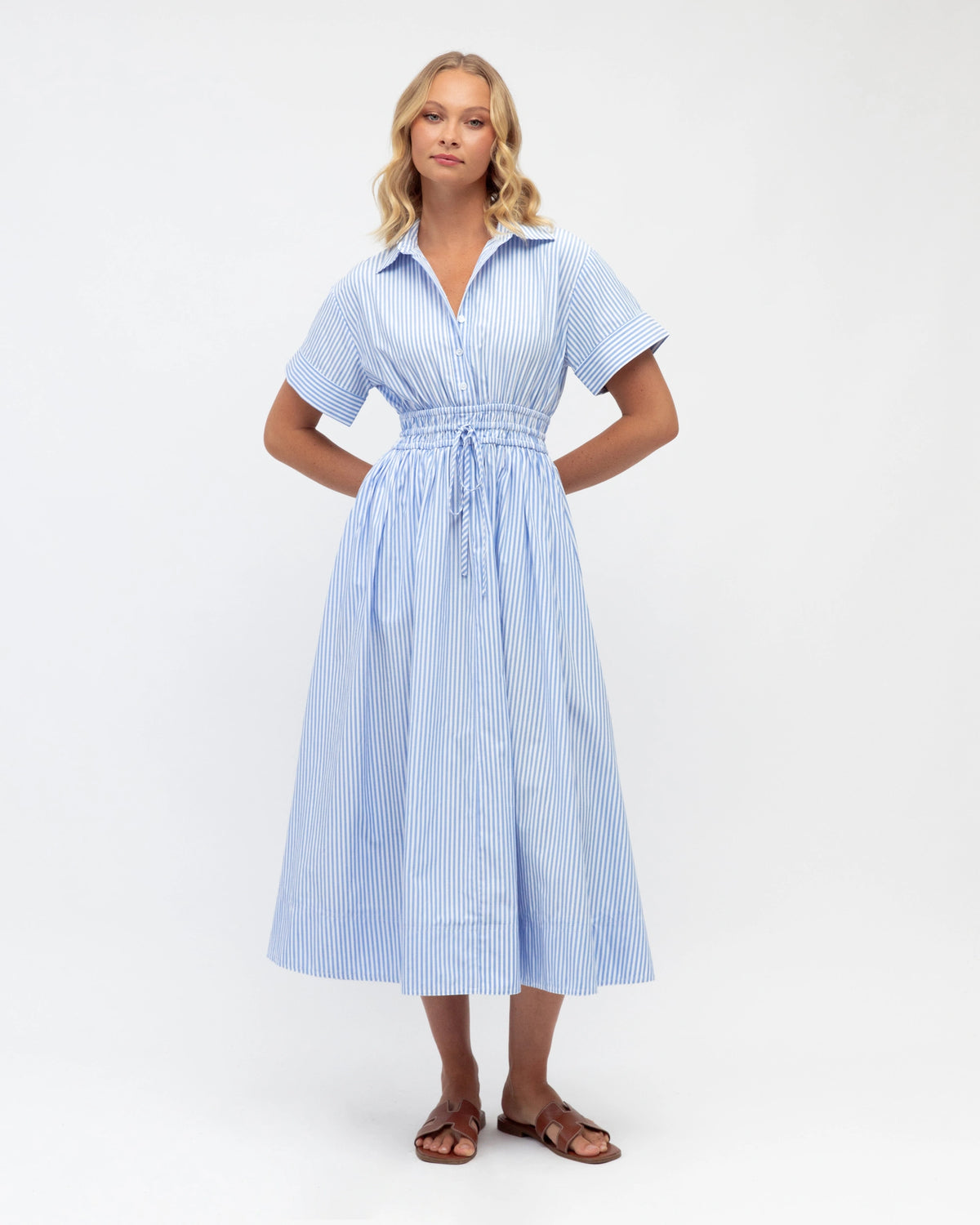 ∙ TF11203-3 ∙ Cotton ∙ 6:8:10:12:14=1:2:2:2:1 ∙ Collared neckline ∙ Short sleeve ∙ Turn-up cuff design ∙ Side pockets ∙ Elastic ruching with tie at the waist ∙ Midi length ∙ Relaxed fit ∙ Our model is wearing size 8