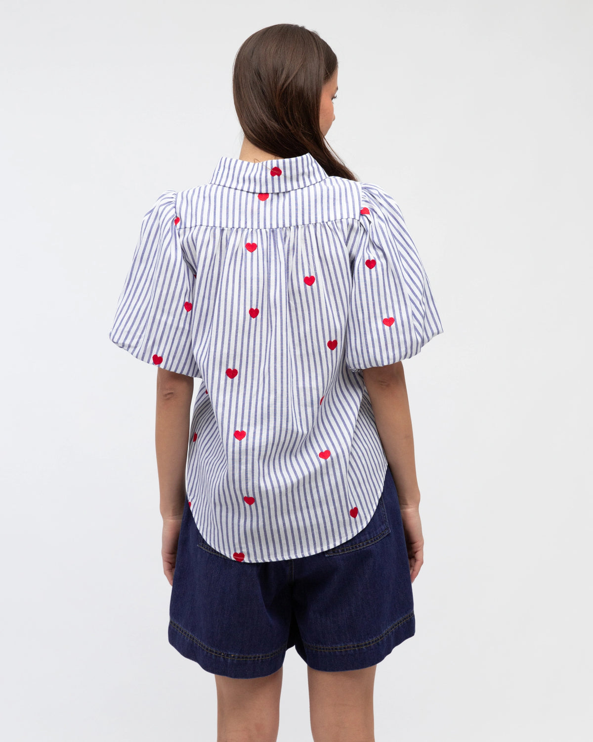 ∙ LOL70771-6 ∙ 100% Cotton ∙ S:M:L:XL=2:2:2:2 ∙ Collared neck ∙ Balloon short sleeve ∙ Button through front ∙ High low hem detail ∙ Embroidered heart throughout ∙ Hip length ∙ Relaxed fit ∙ Our model is wearing size S