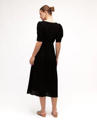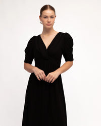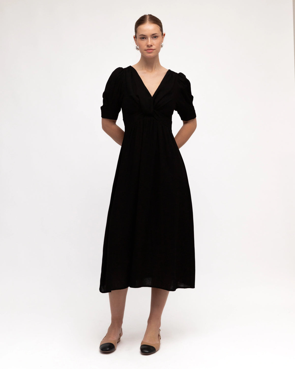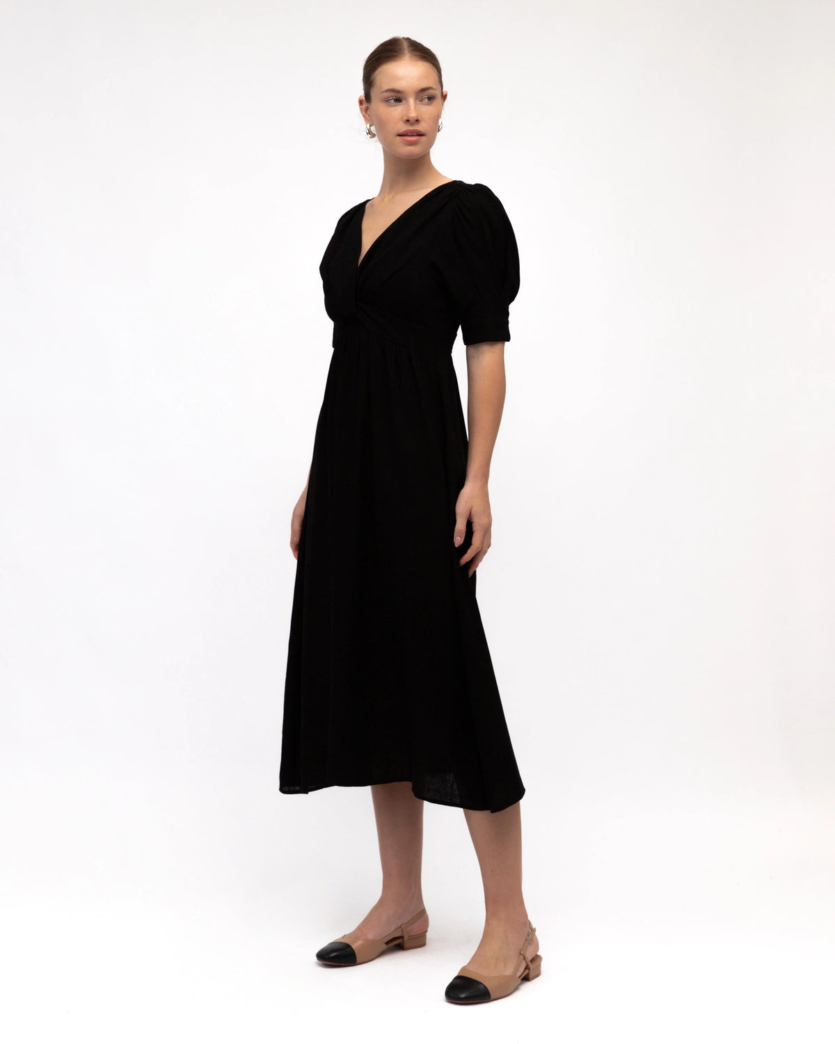 ∙ TF10911 ∙ Rayon/Linen ∙ 6:8:10:12:14=1:2:2:2:1 ∙ V neckline ∙ Puff short sleeves ∙ Twist waist detail ∙ Central back zipper design ∙ Midi length ∙ Relaxed fit ∙ Our model is wearing size 8