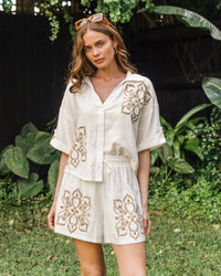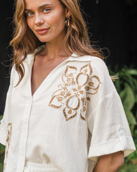 ∙ LOL70745 ∙ Rayon/Linen ∙ S:M:L:XL=2:2:2:2 ∙ Collared neckline ∙ Short sleeve ∙ Button Cuff Sleeve ∙ Front embroidered design ∙ Standard length ∙ Button through front ∙ Relaxed fit ∙ Our model is wearing size S