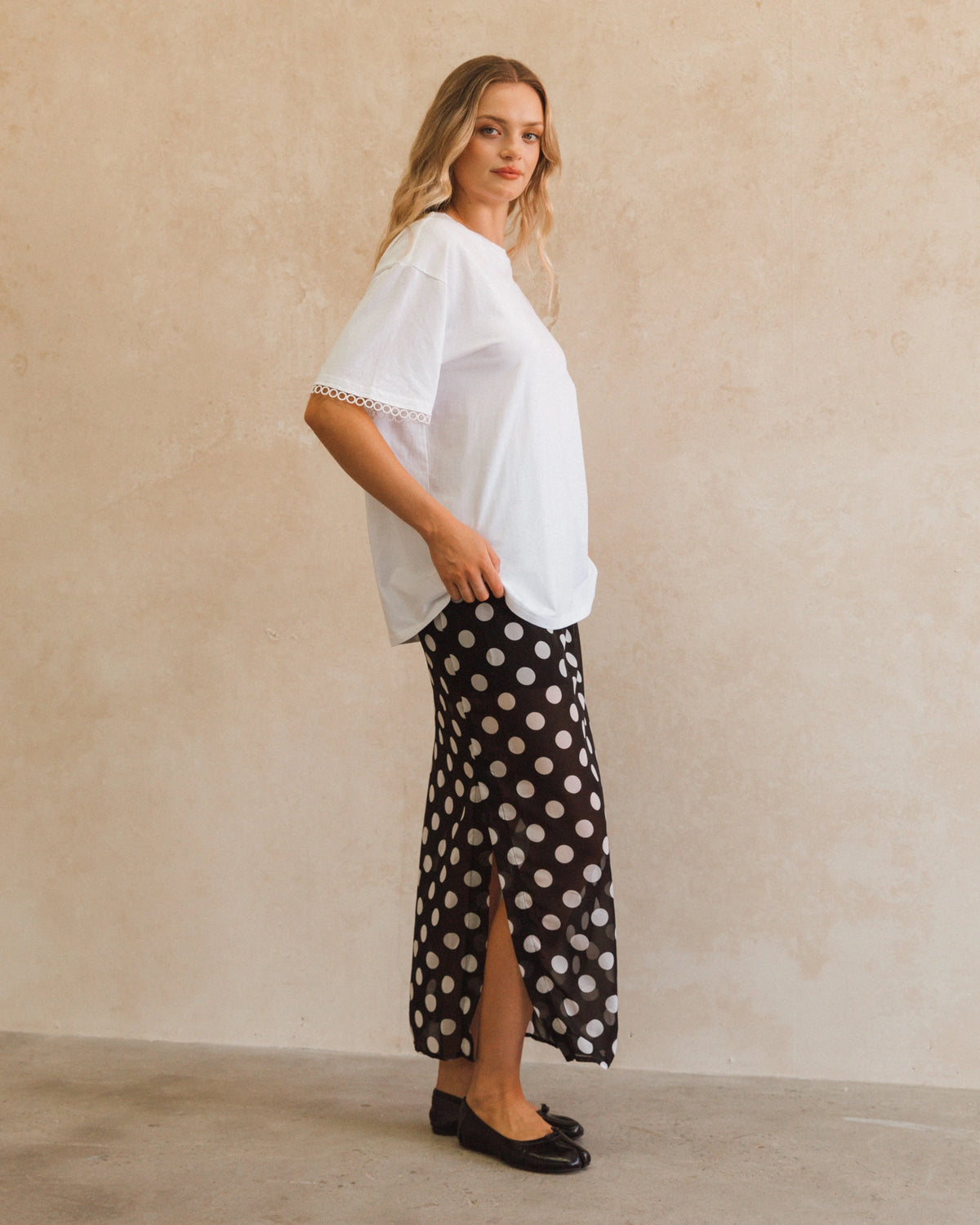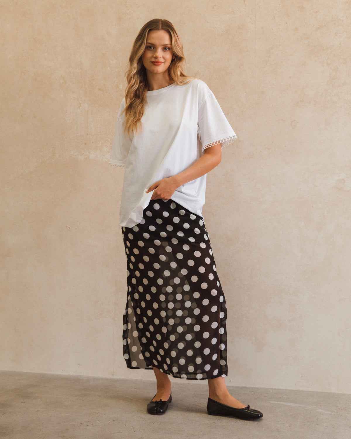 ∙ PH14183∙ Polyester∙ 6:8:10:12:14=1:2:2:2:1∙ High-waisted∙ Elasticated waist band∙ Partially lined to above the knee∙ Polka dot pattern throughout∙ Maxi length∙ Relaxed fit∙ Our model is wearing size 8