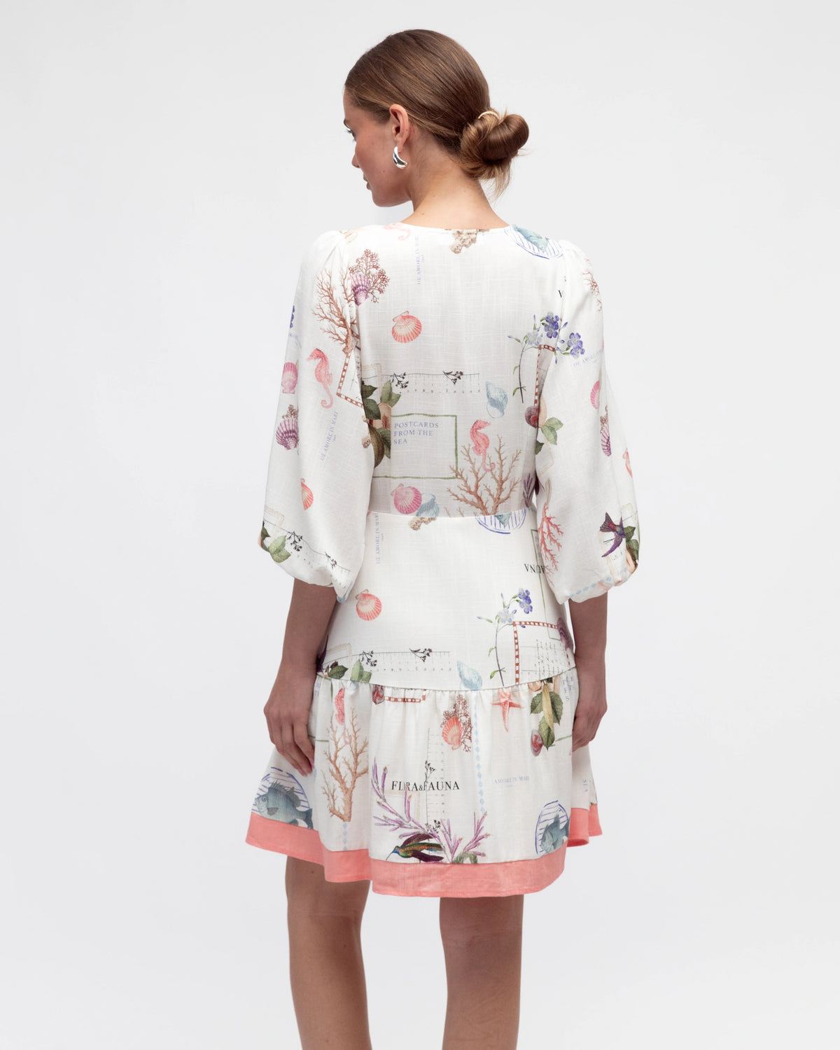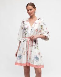 ∙ TFE10993 ∙ Rayon ∙ 6:8:10:12:14=1:2:2:2:1 ∙ Exclusive print ∙ V neckline ∙ Puff short sleeves ∙ Button fastening detail ∙ Detachable belt design ∙ Full lined ∙ Mini length ∙ Relaxed fit ∙ Our model is wearing size 8