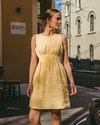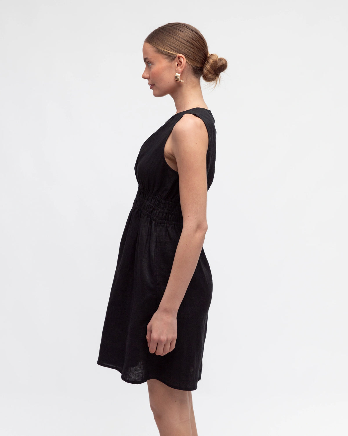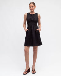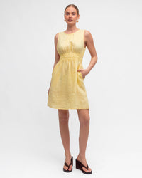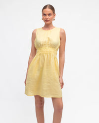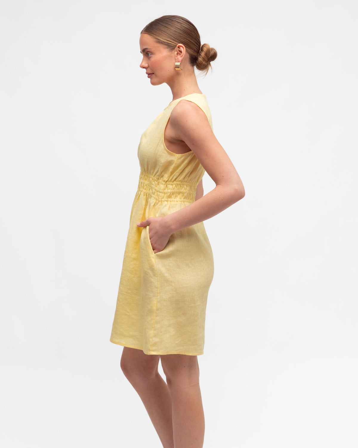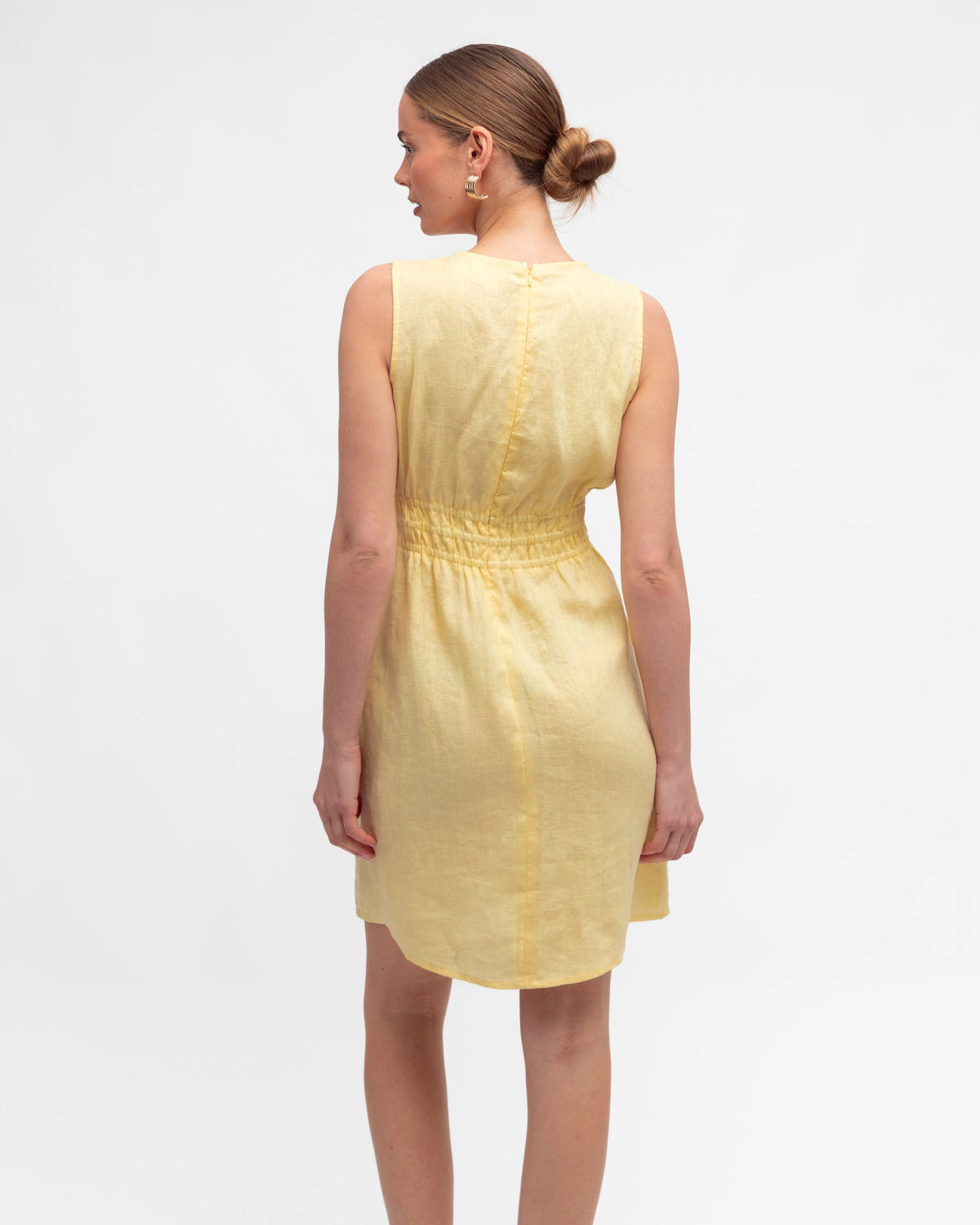 ∙ TFL10981∙ 100% Linen∙ 6:8:10:12:14=1:2:2:2:1∙ High neckline∙ Sleeveless∙ Front gathered detail∙ Shirred elastic waist design∙ Invisible CB zipper∙ Mini length∙ Relaxed fit∙ Our model is wearing size 8
