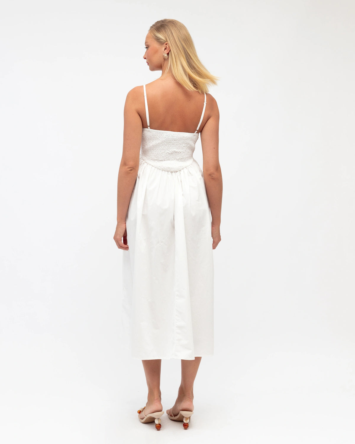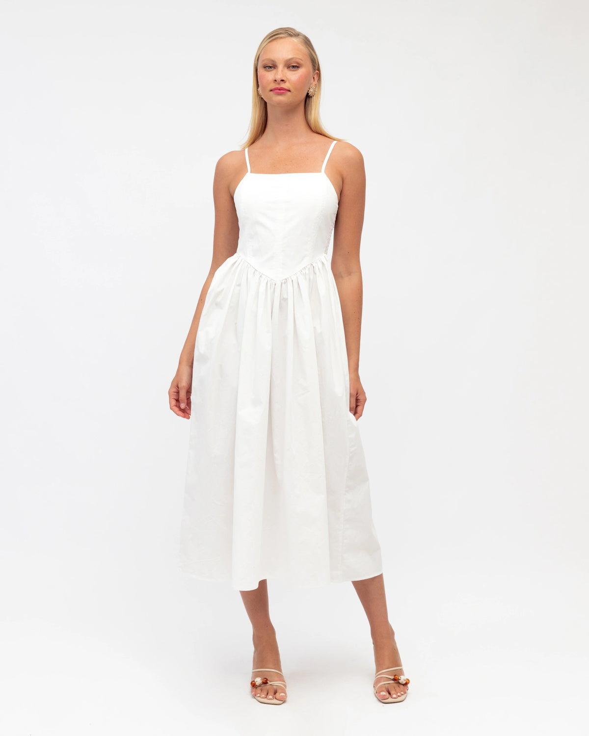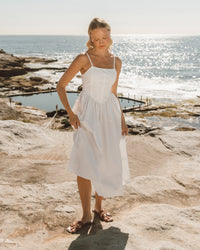 ∙ PH12865∙ 100% Cotton∙ 6:8:10:12:14=1:2:2:2:1∙ Square neckline∙ Sleeveless∙ Thin, adjustable straps∙ Shirred back bodice design∙ Midi length∙ Relaxed fit∙ Our model is wearing size 8