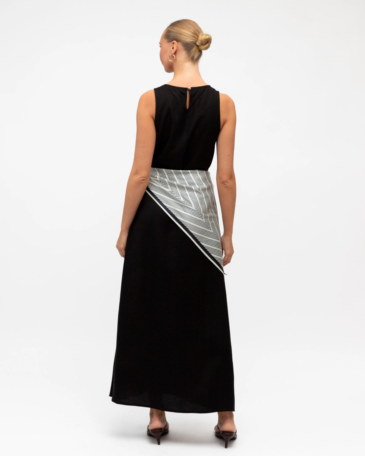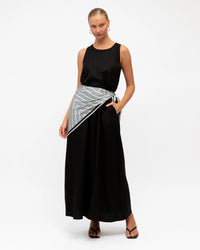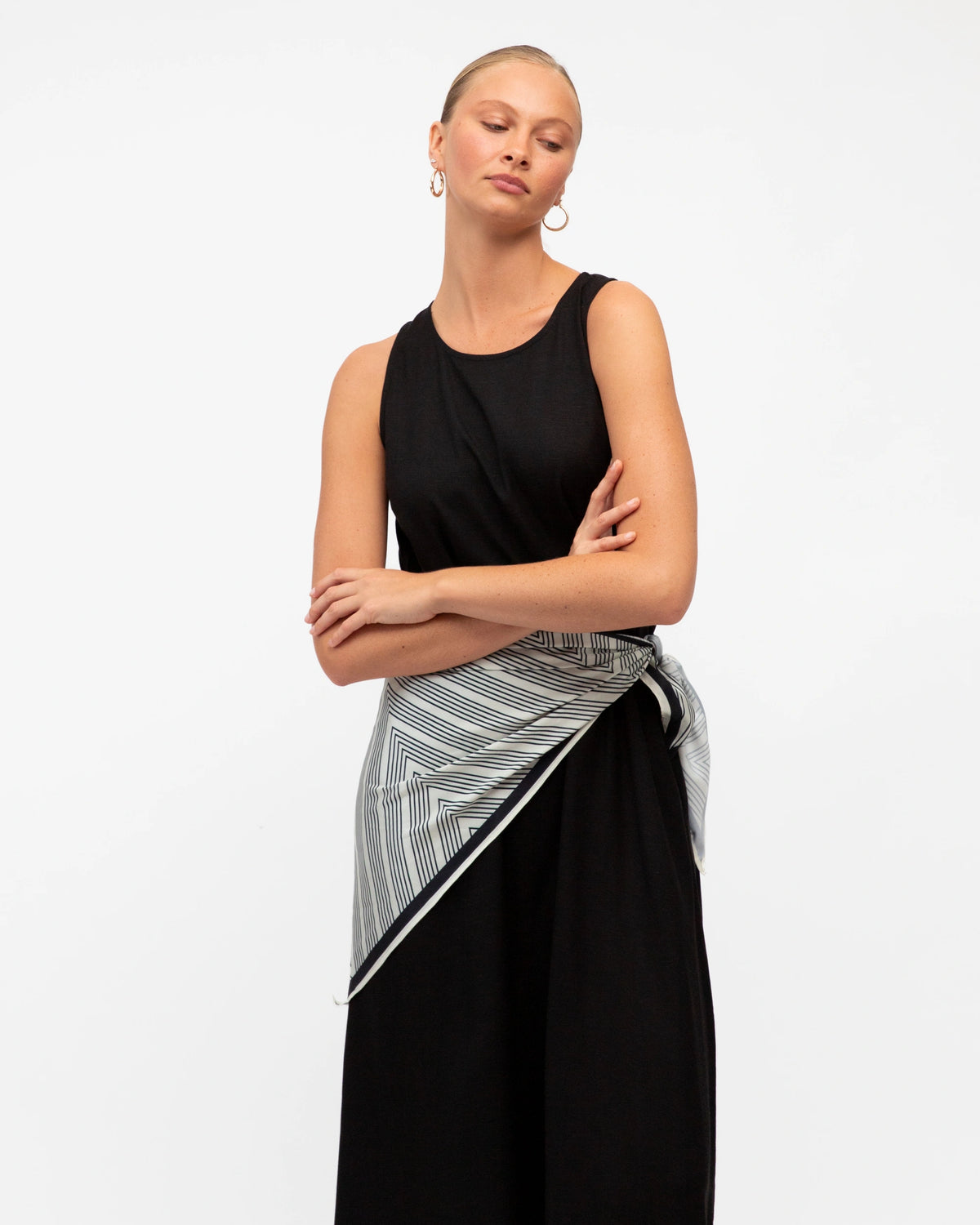 ∙ TF11803∙ Rayon/Linen∙ 6:8:10:12:14=1:2:2:2:1∙ Round neckline∙ Sleeveless∙ Paired with striped scarf wrap∙ CB keyhole button∙ Side pockets∙ Maxi length∙ Relaxed fit∙ Our model is wearing size 8