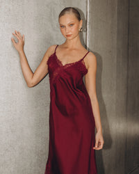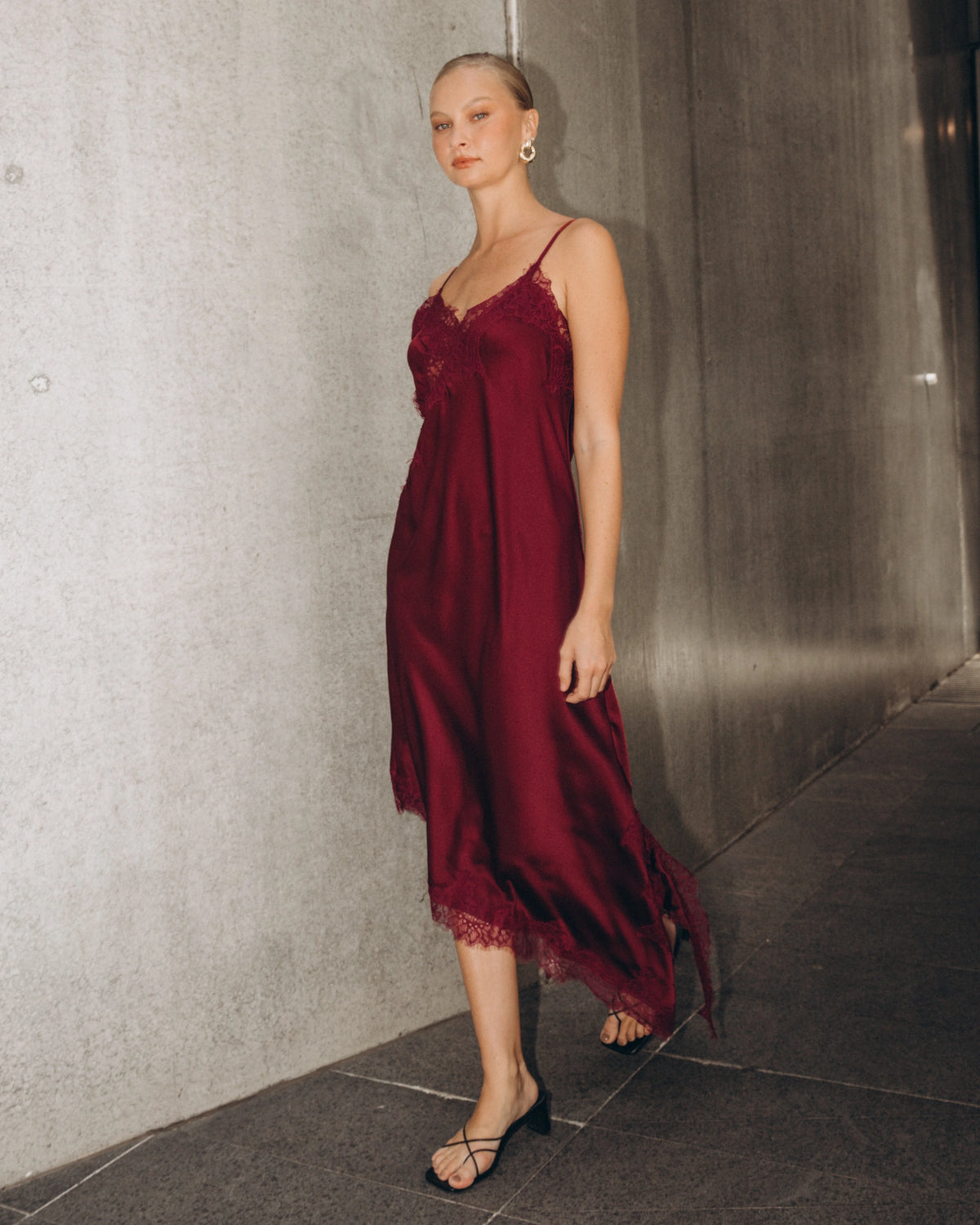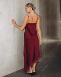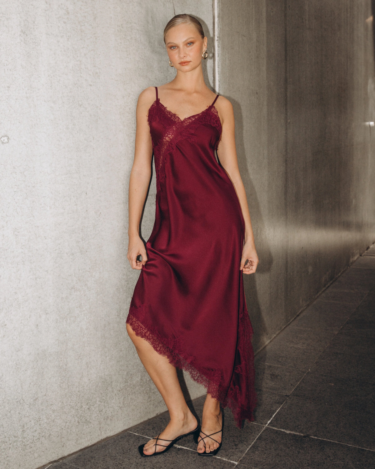 ASYM HEM LACE INSERT SATIN MIDI DRESS