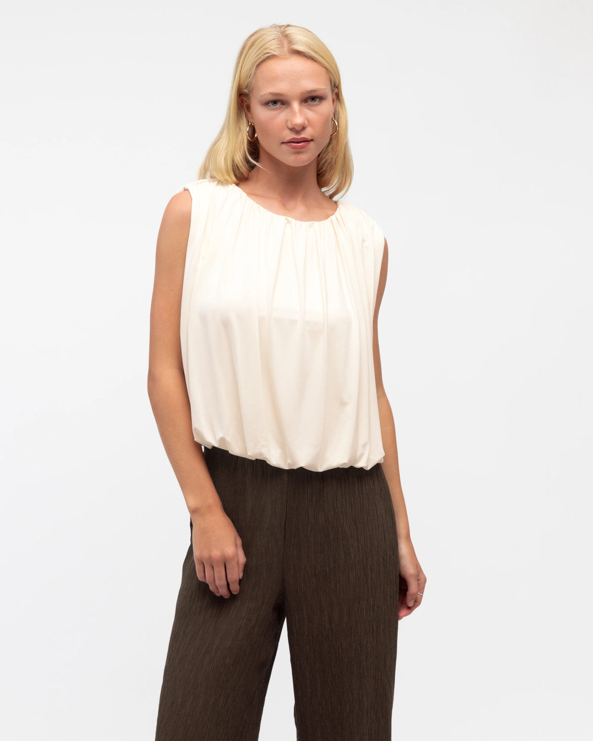 ∙ TF11518∙ Viscose∙ 6:8:10:12:14=1:2:2:2:1∙ Crew neck∙ Sleeveless∙ Back keyhole with button loop closure∙ Bubble hem design∙ Regular fit∙ Our model is wearing size 8