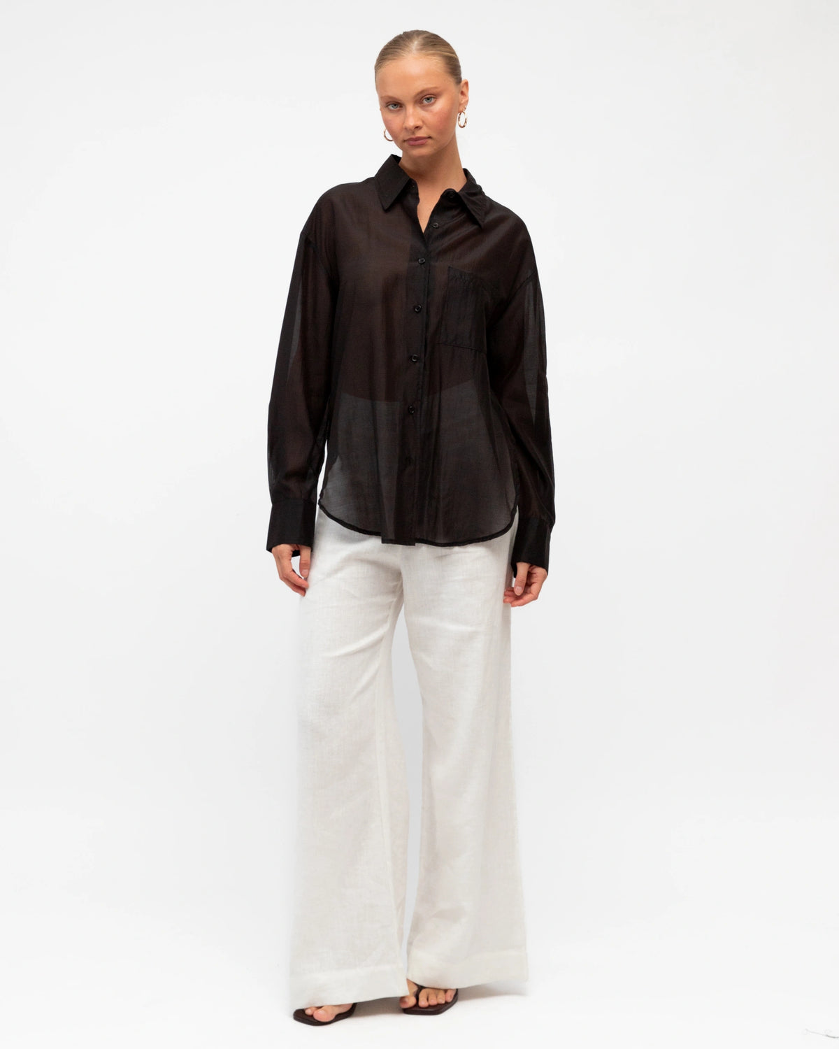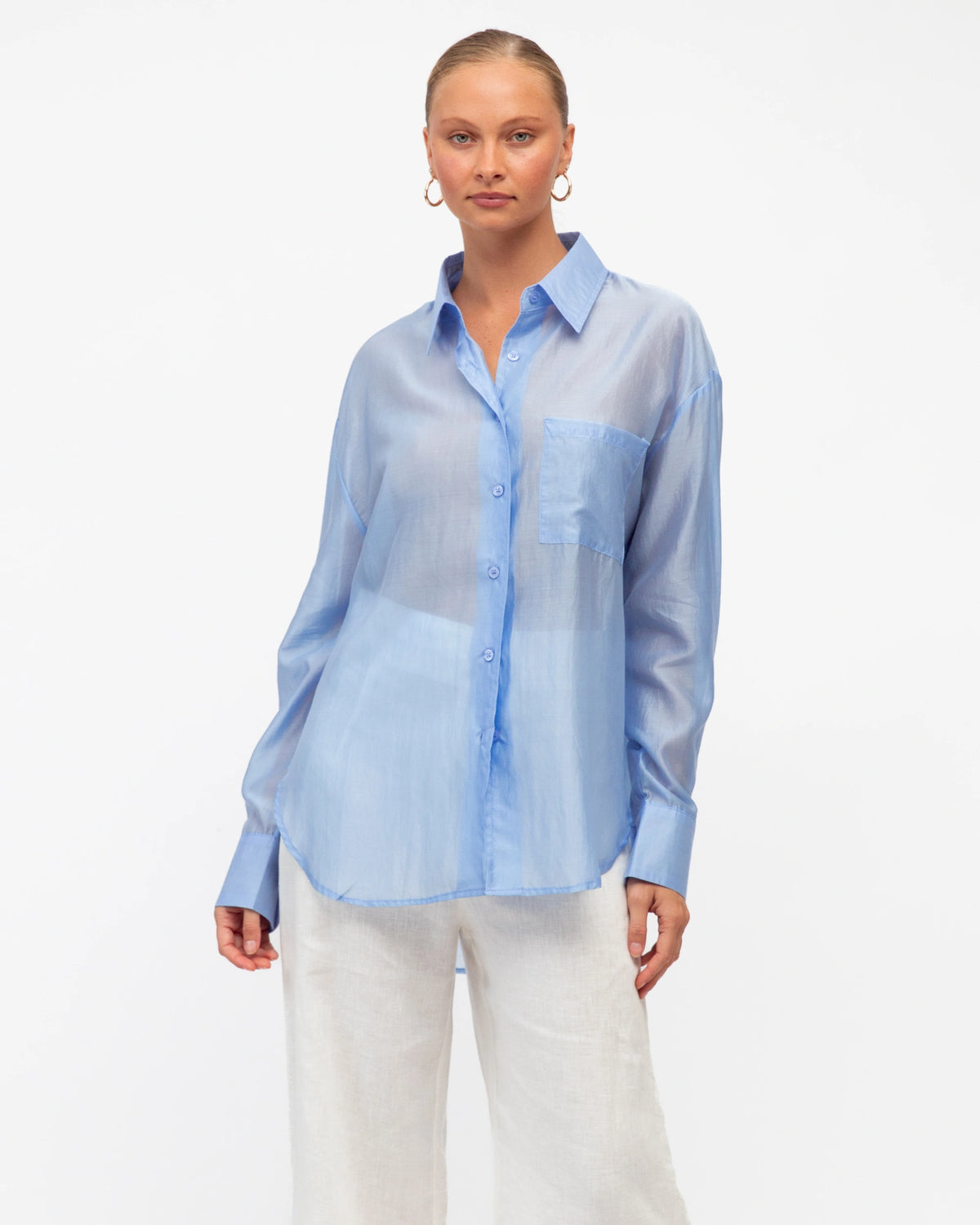 ∙ TF10475-16∙ Viscose∙ 6:8:10:12:14=1:2:2:2:1∙ Collared neckline∙ Long sleeve∙ Chest pocket design∙ Slightly sheer∙ High-low curved hemline∙ Front button closure∙ Regular fit∙ Our model is wearing size 8