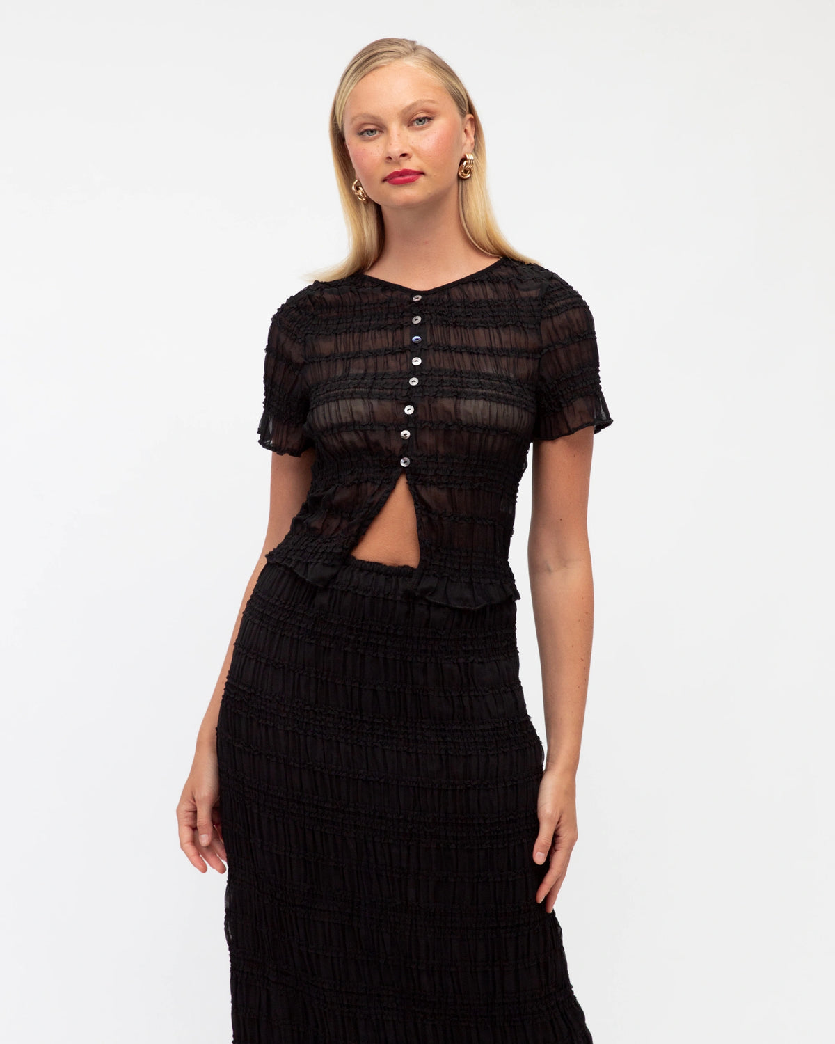 ∙ PH12729∙ Polyester∙ 6:8:10:12:14=1:2:2:2:1∙ Round neckline∙ Short sleeve∙ Button down∙ Smocking detail∙ Relaxed Fit∙ Our model is wearing size 8