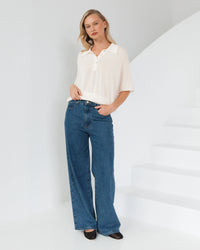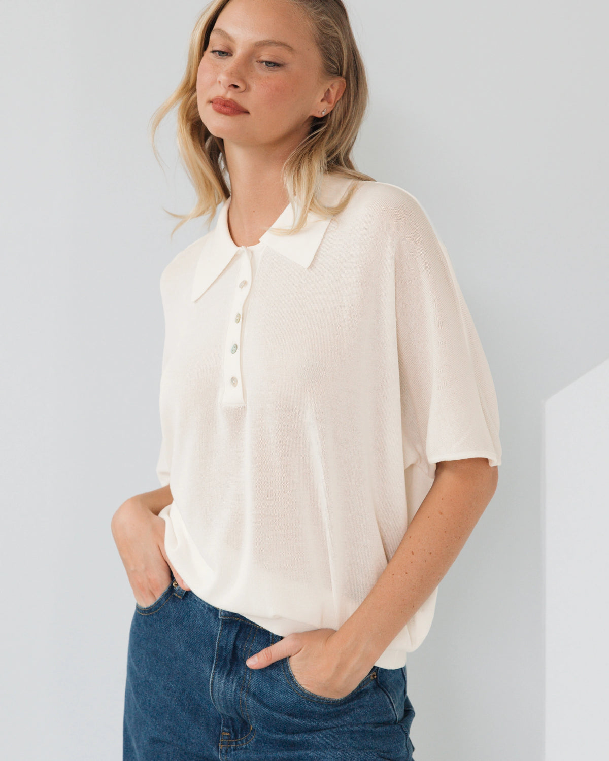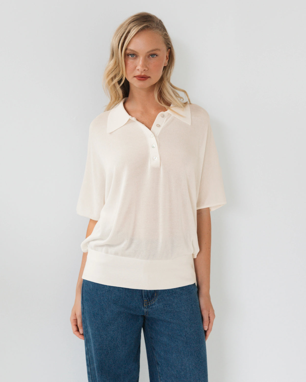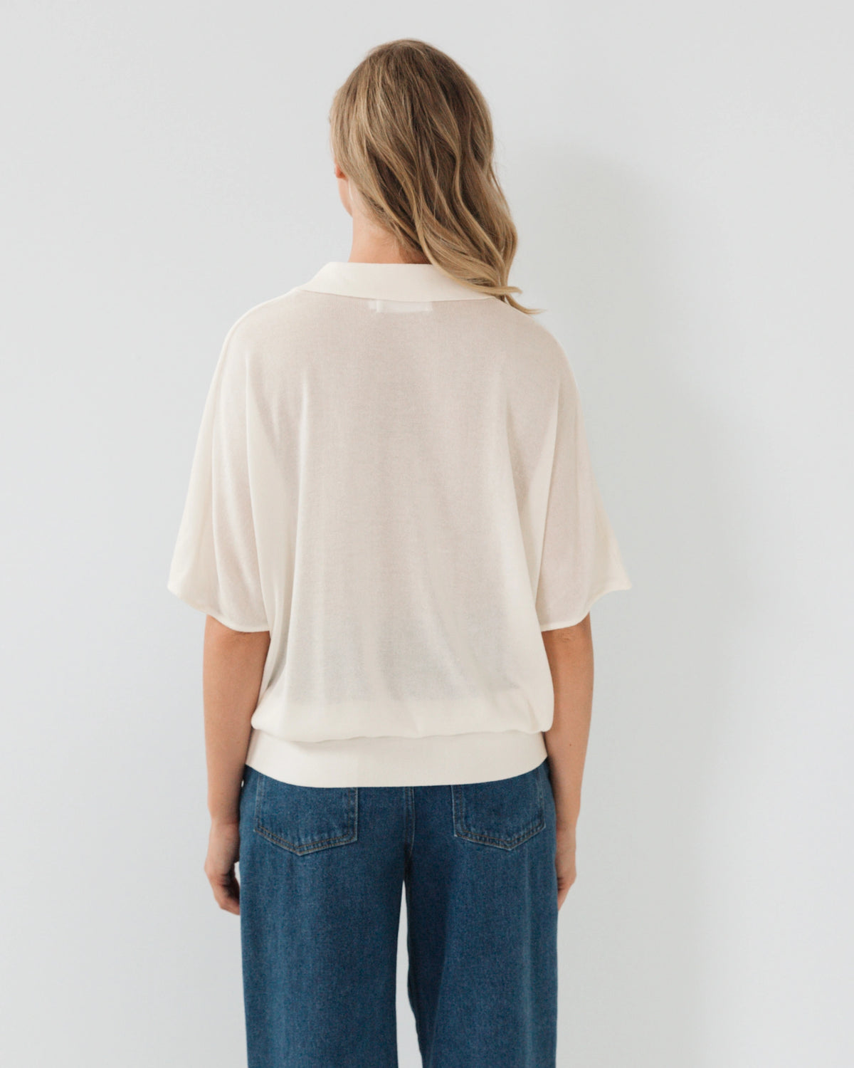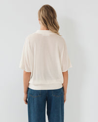 OVERSIZED SHEER KNIT POLO WITH FITTED WAISTBAND