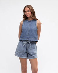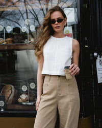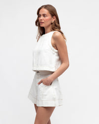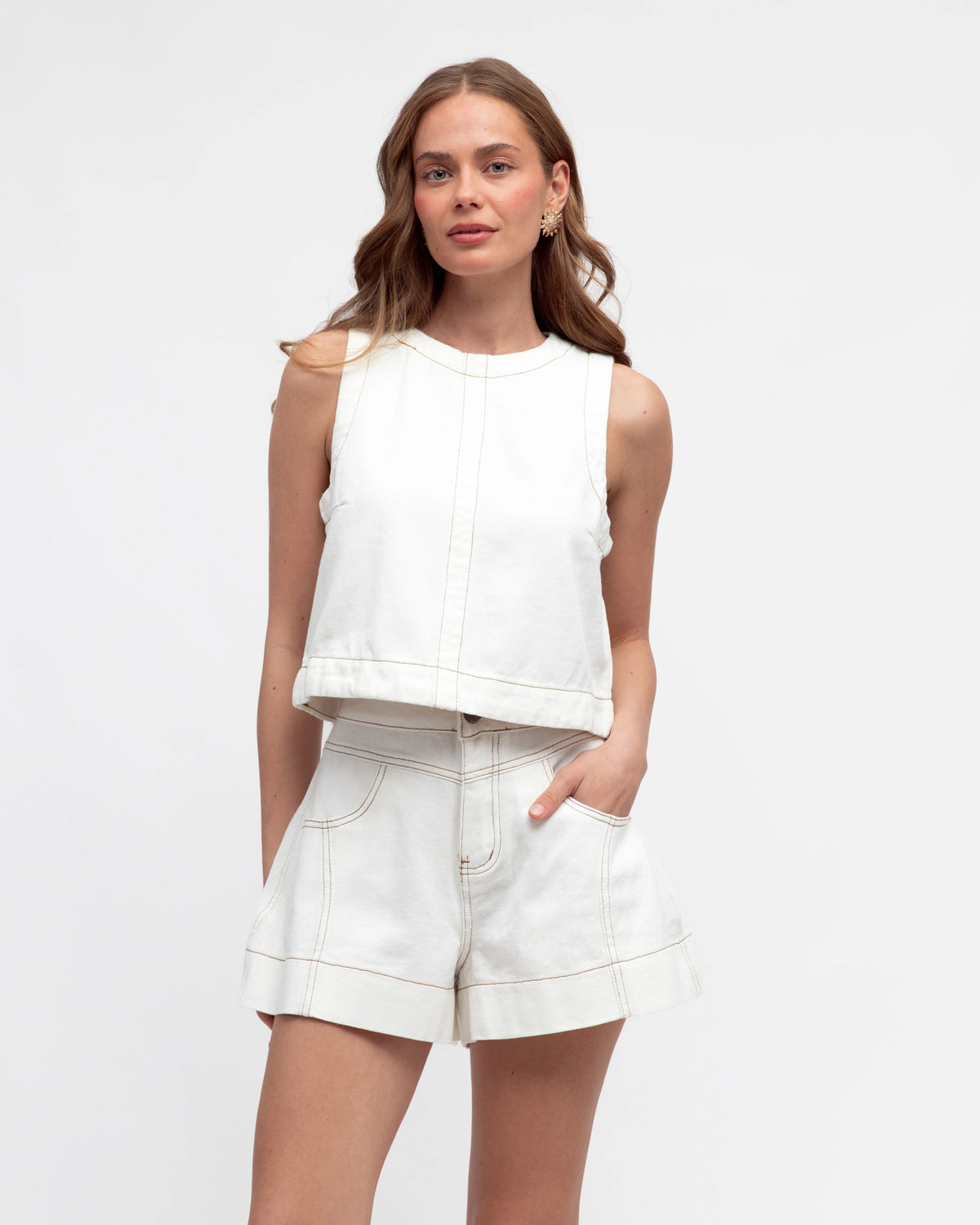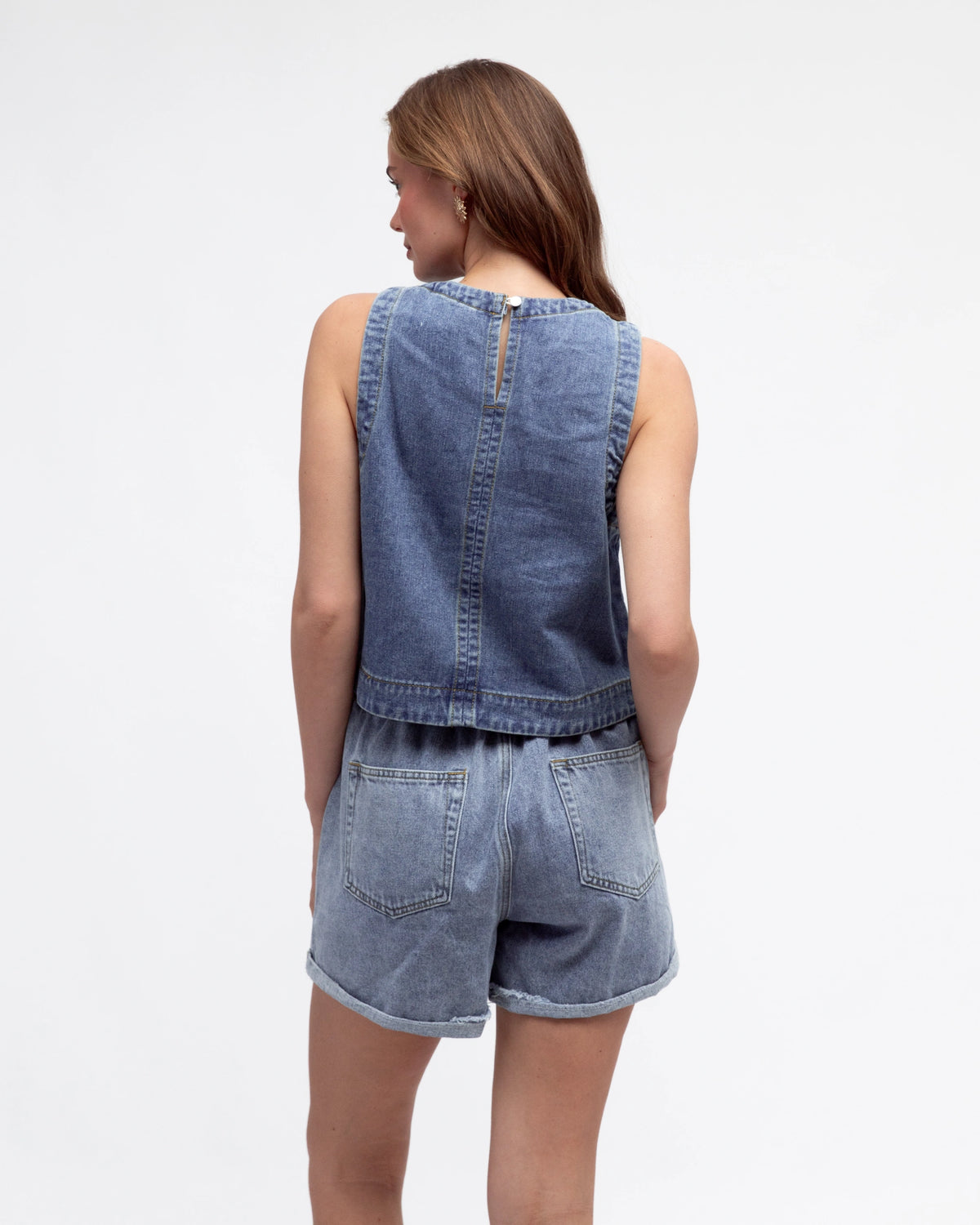∙ PH12884∙ 100% Cotton∙ 6:8:10:12:14=1:2:2:2:1∙ Round neck∙ Sleeveless∙ Keyhole opening with button and loop closure∙ Swing cut∙ Cropped length∙ Relaxed fit∙ Our model is wearing size 8