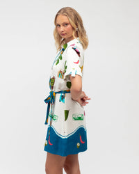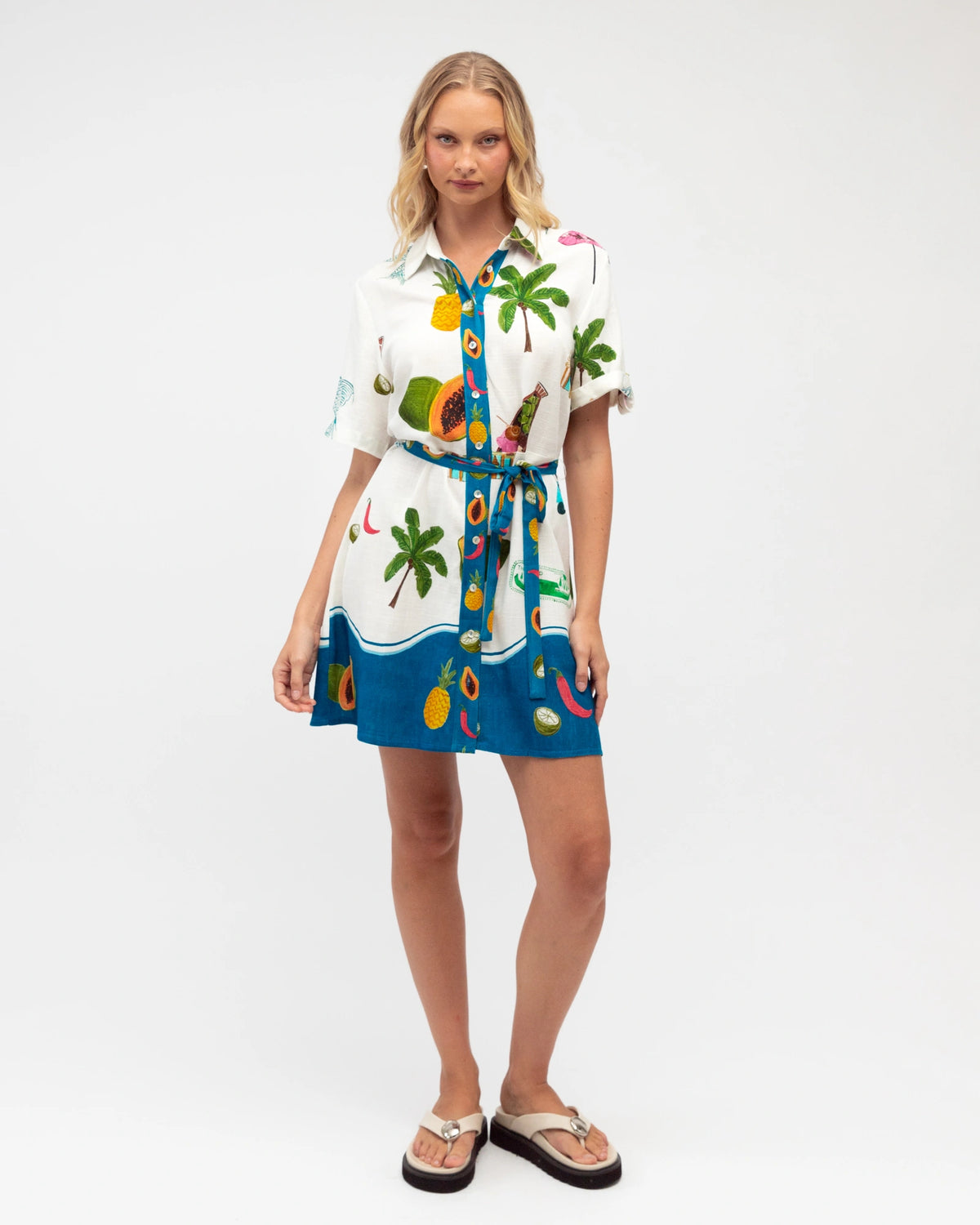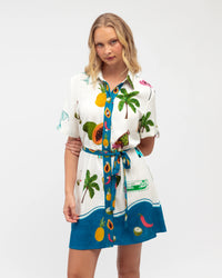 ∙ PHE13083 ∙ Rayon/Linen ∙ 6:8:10:12:14=1:2:2:2:1 ∙ Exclusive print ∙ Collared neckline ∙ Short sleeve with turned cuff ∙ Button through front ∙ Adjustable tie at waist design ∙ Mini length ∙ Relaxed fit ∙ Our model is wearing size 8